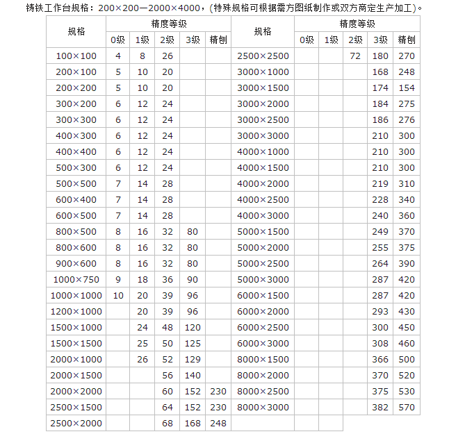 鑄鐵工作臺精度:按國家標準計量檢定規程執行,分別為00、0、1、2、3和精刨六個等級。